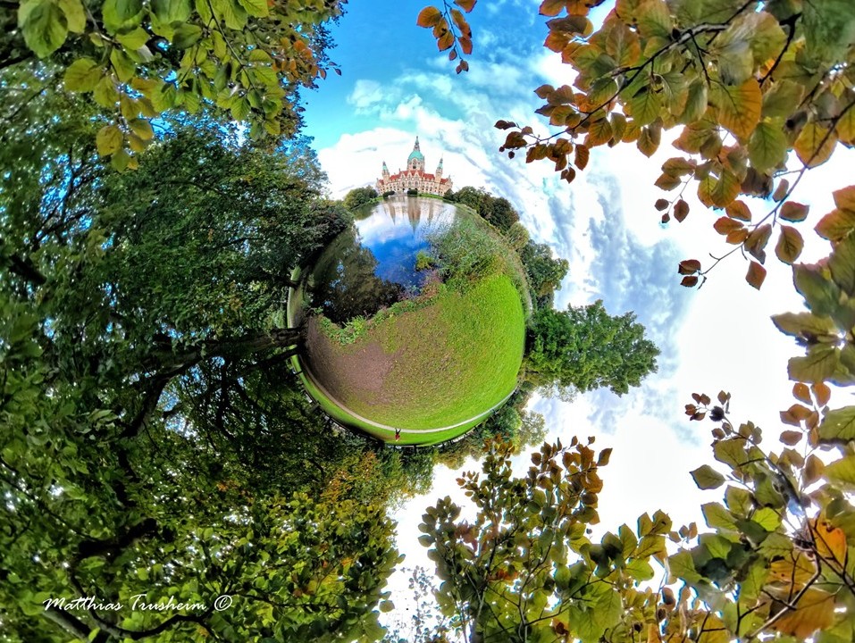 360°-Tiny-Planet-Perspektive vom Maschpark in Hannover mit Blick auf das Neue Rathaus